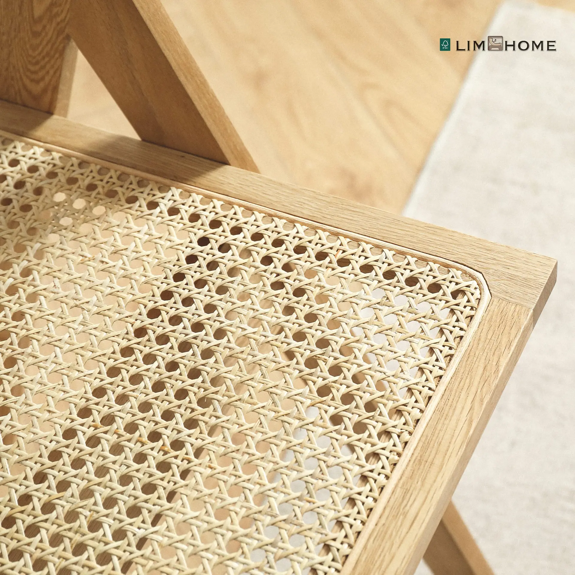 Der Stuhl beinhaltet eine indonesische Rattan-Oberfläche, die mit einer sechseckigen Röhre manuell gewebt wird, und ist an allen Seiten mit einem ganzen Rattanstück akribisch eingefasst. Außer seiner Beständigkeit und Haltbarkeit bietet die Rattan-Rückenlehne auch eine bequeme Rückfederung.